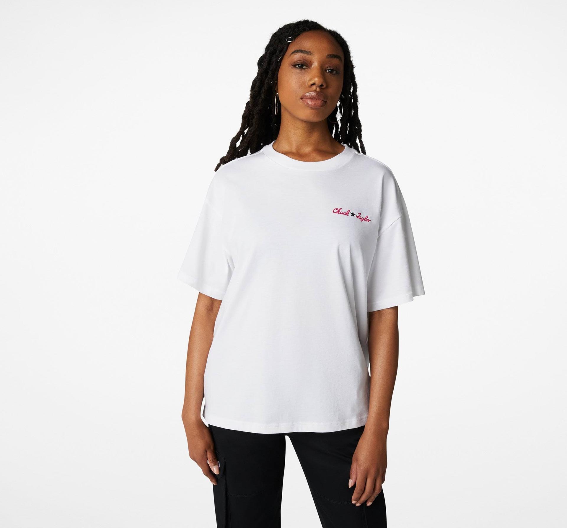 Vlnitý vzor heatwave vyplňuje ikonickou hvězdu, která zdobí zadní část tohoto volného trička. Ruční podpis Chuck Taylor vepředu i vzadu z trička dělá základní kousek značky.