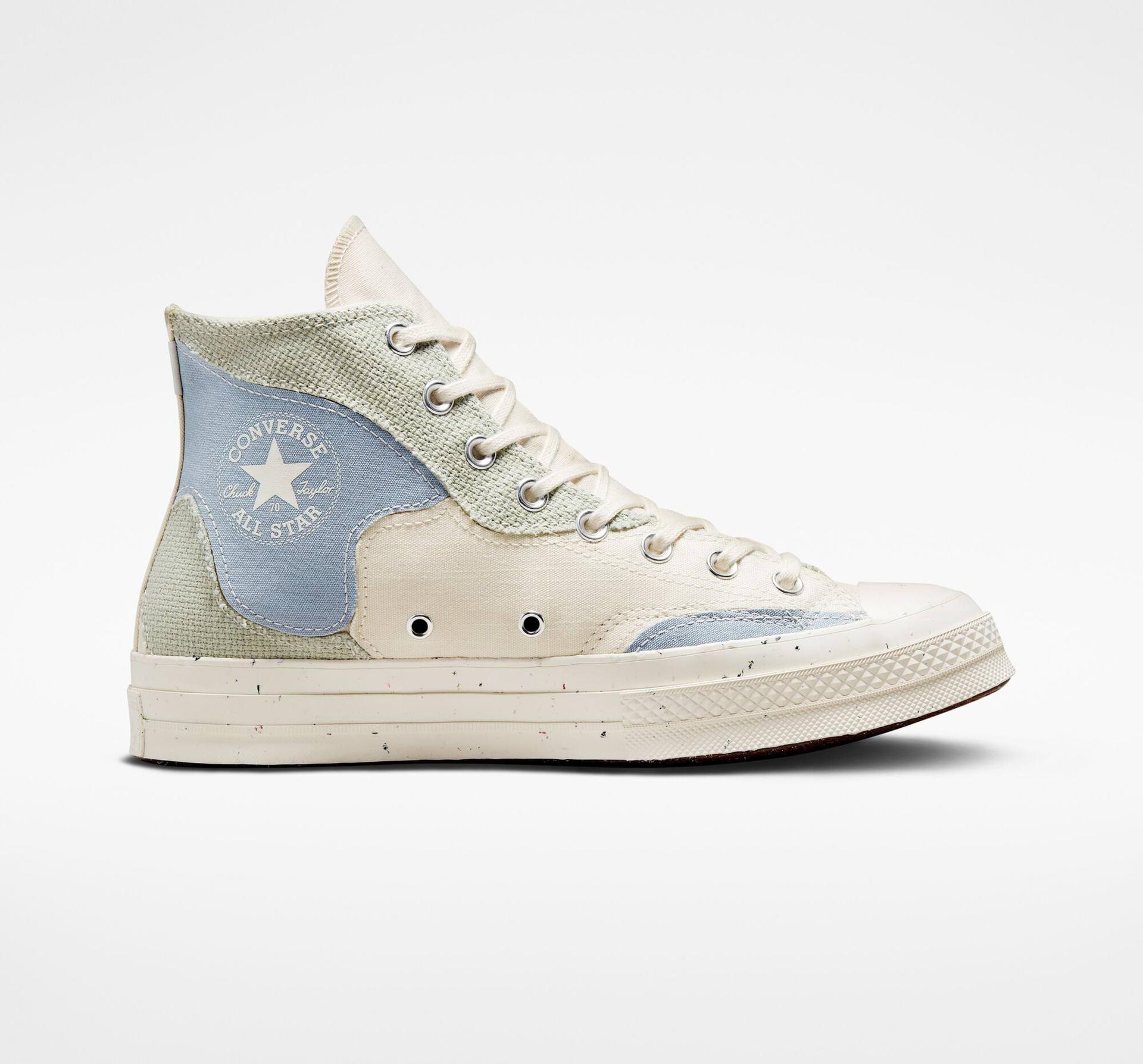 Кецовете premium Chuck 70 взаимстват най-новия си външен вид в дизайн, който напомня за планетата. Игриви вълни от елементарно памучно платно в земни тонове се обединяват за текстуриран, многослоен вид, за да създадат илюзията за движение. Каучуковите отпадъци от производствения процес придават на междинната подметка уникален, пъстър външен вид. Завършени с памучна подплата.