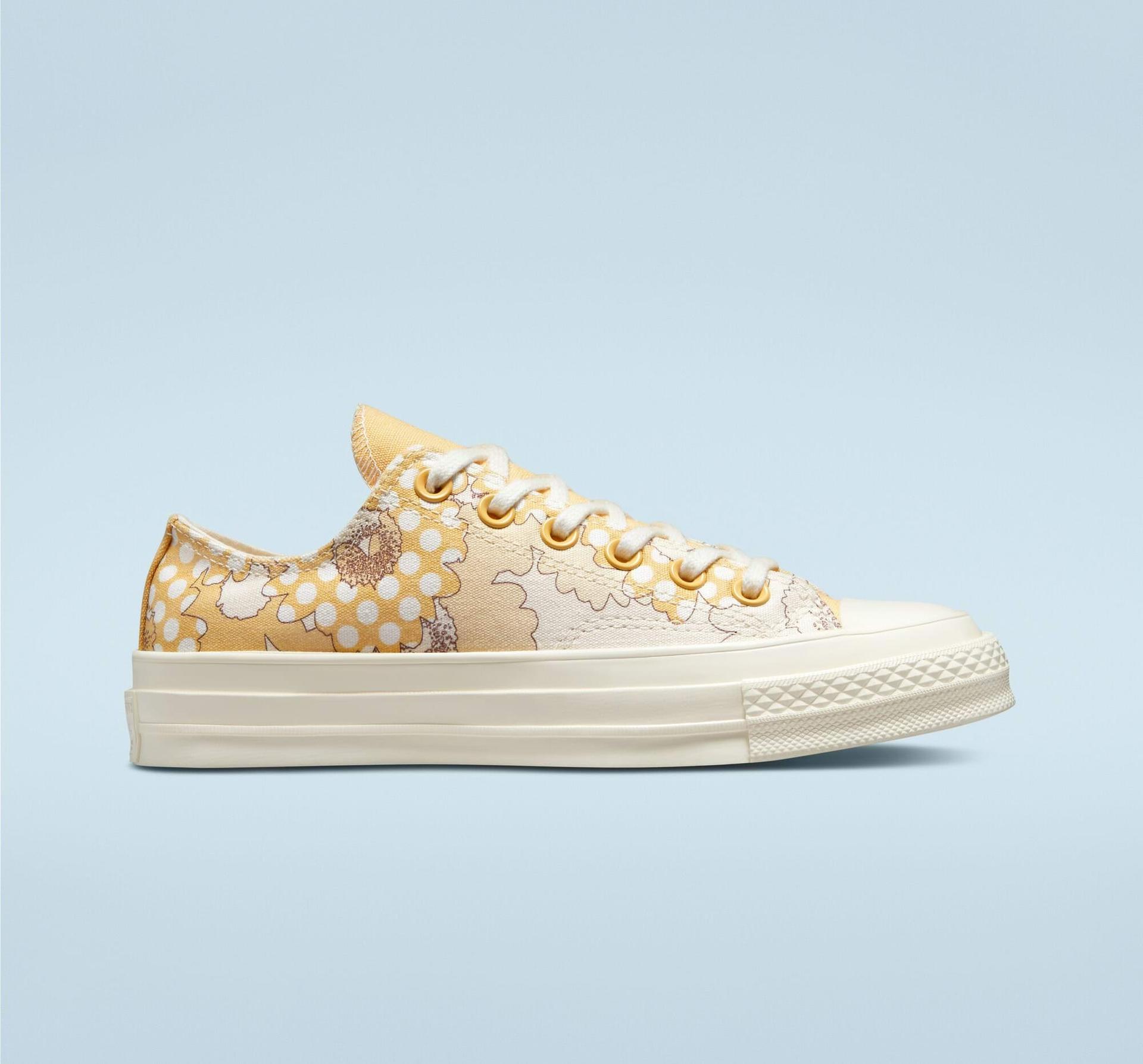 Ikona 70. let posouvá letní vyjadřování o stupeň výš. Klasické puntíky a velkoplošné květiny maximalizují vaši lásku ke květinám na pozadí svršku z recyklovaného bavlněného plátna, které kvete uvolněnými letními barvami. Komplet s prémiovými detaily Chuck 70, jako jsou lesklá mezipodešev, ploché bavlněné tkaničky a extra tlumení. Bež a rozkvétej.