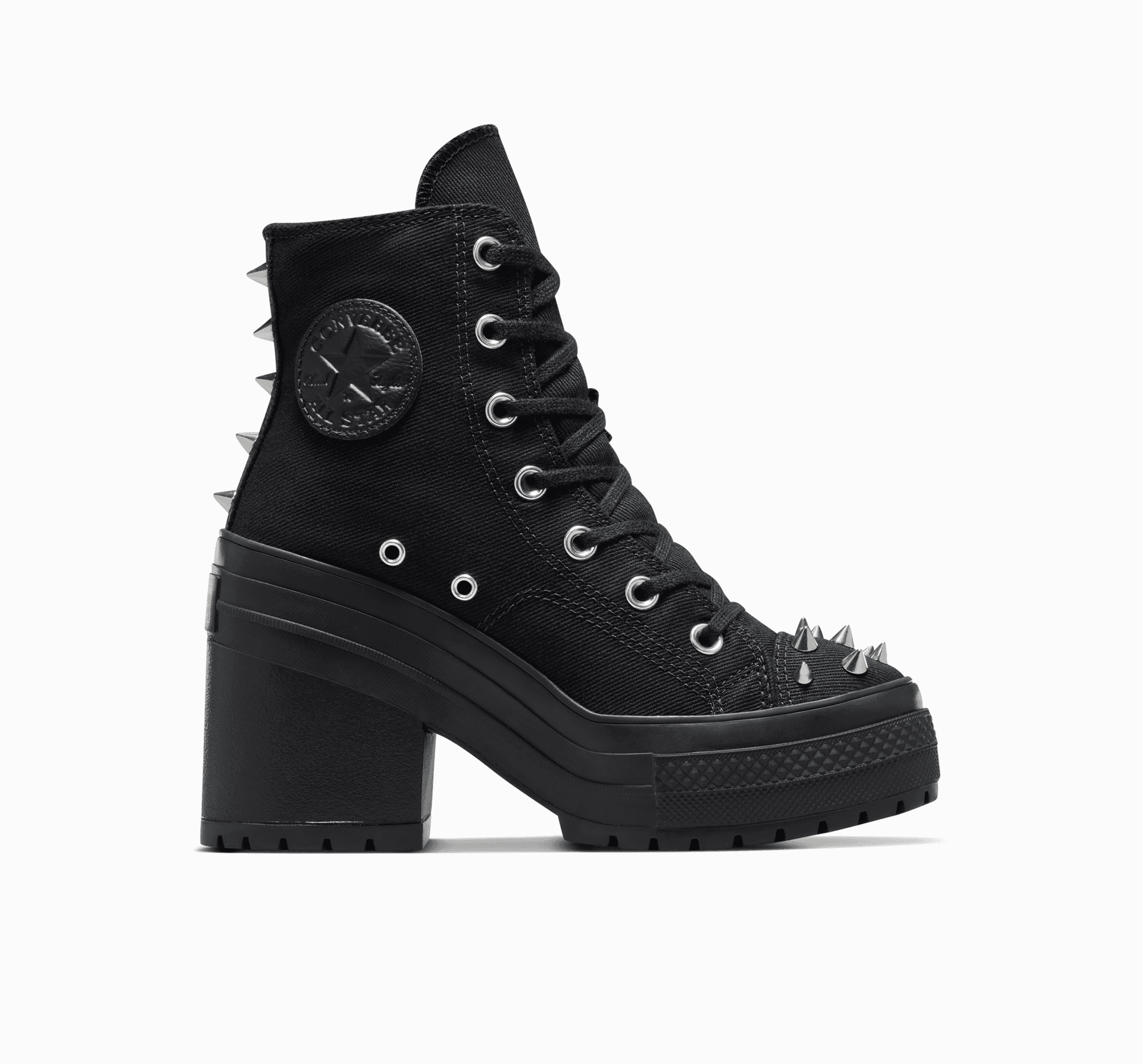 Ukažte svou známku punku v ikonickém stylu tenisek Chuck Taylor. Boty na podpatku Chuck 70 De Luxe Heel ve výrazné aktualizované verzi s cvoky s hroty po celé ploše, které zapůsobí.
