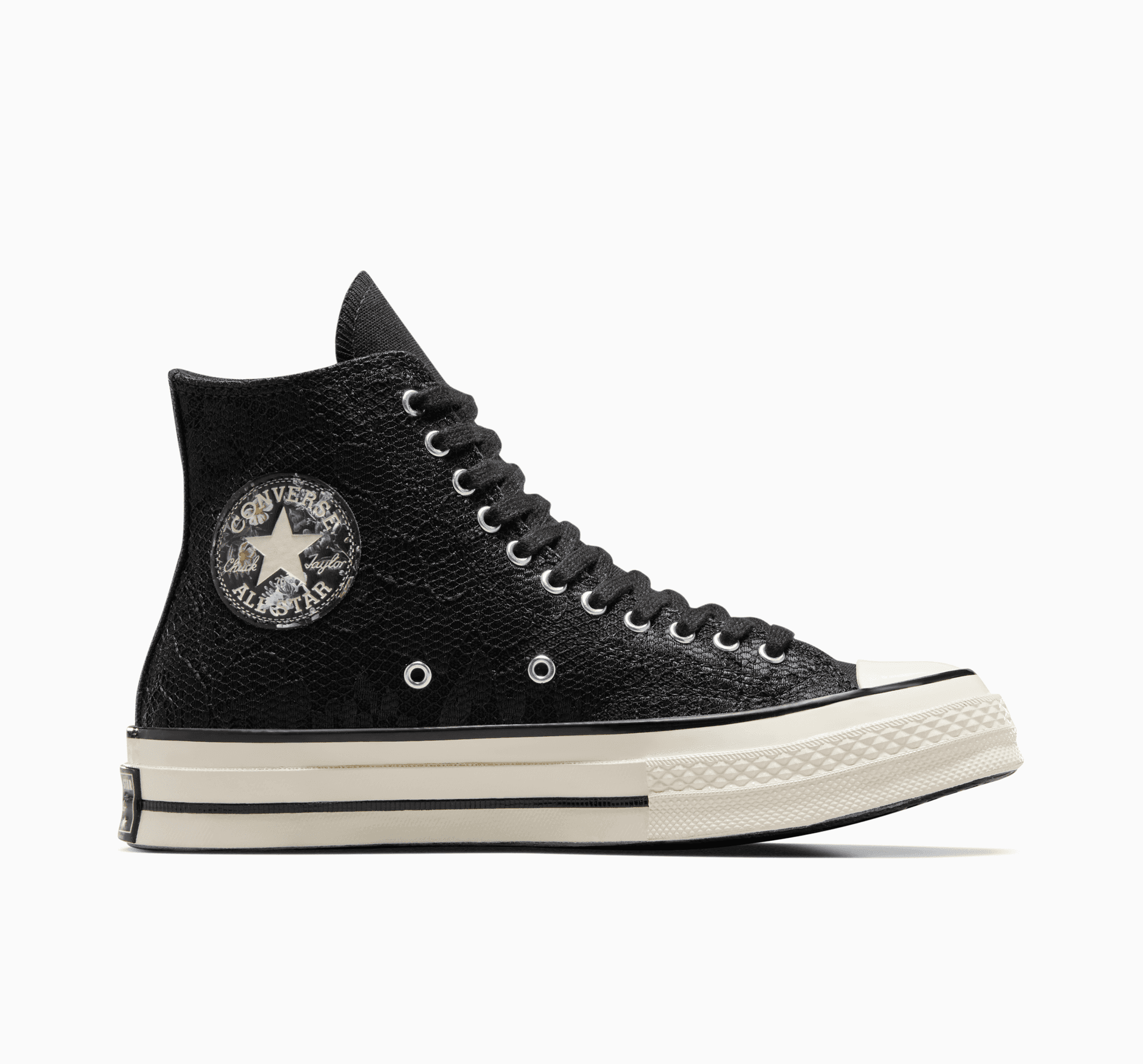 Poodhalte svou záhadnou stránku v kotníkových teniskách, které jen vypadají nesměle. Krajka v temné barvě působí výrazně, ale květinové vzory zachovávají jemnost. Detaily prémiových tenisek Chuck 70 jsme zachovali, ale přidali jsme trošku dramatičnosti.