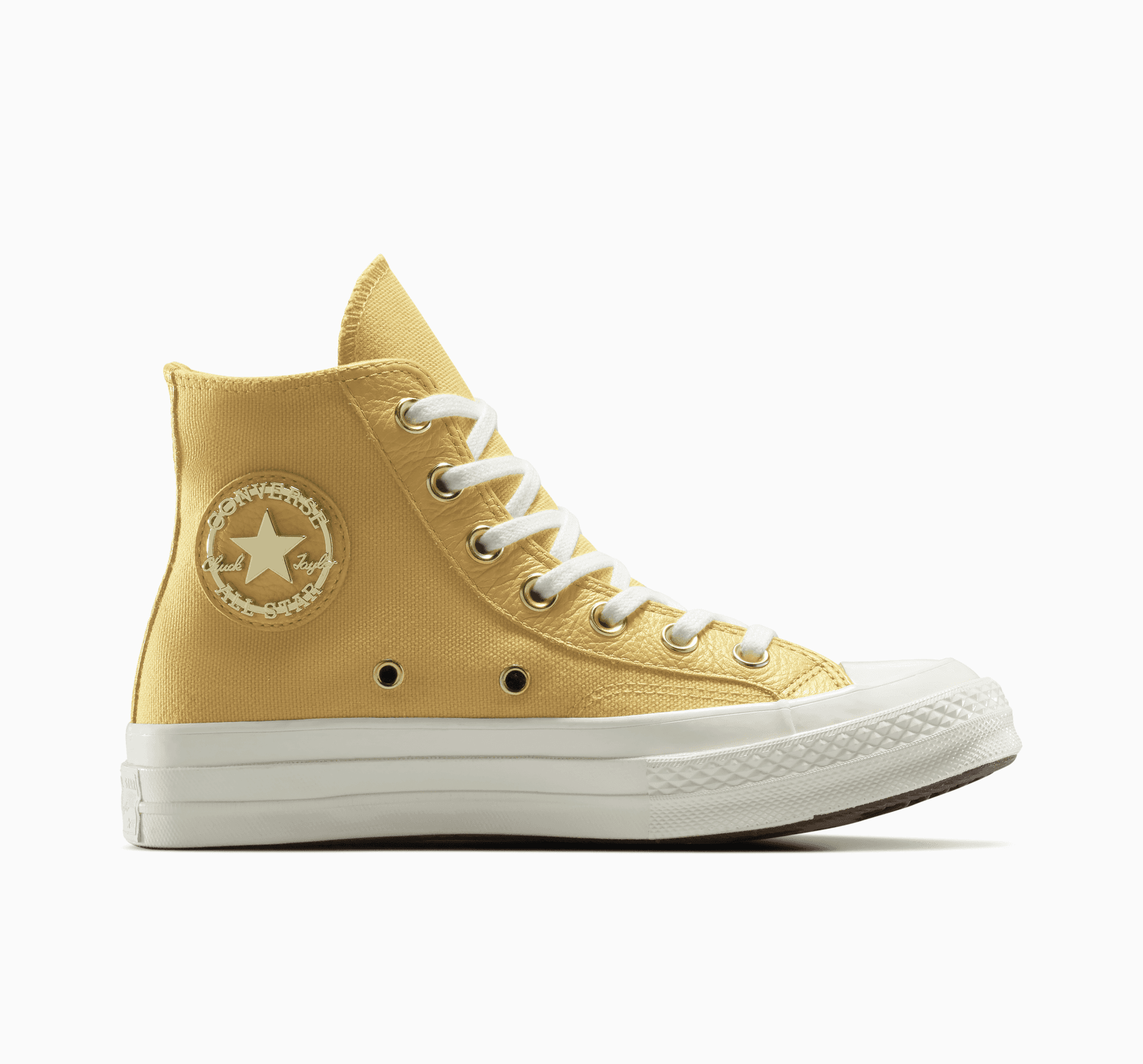 - Leather Chuck Taylor ankle patch with gold-tinted metal overlays