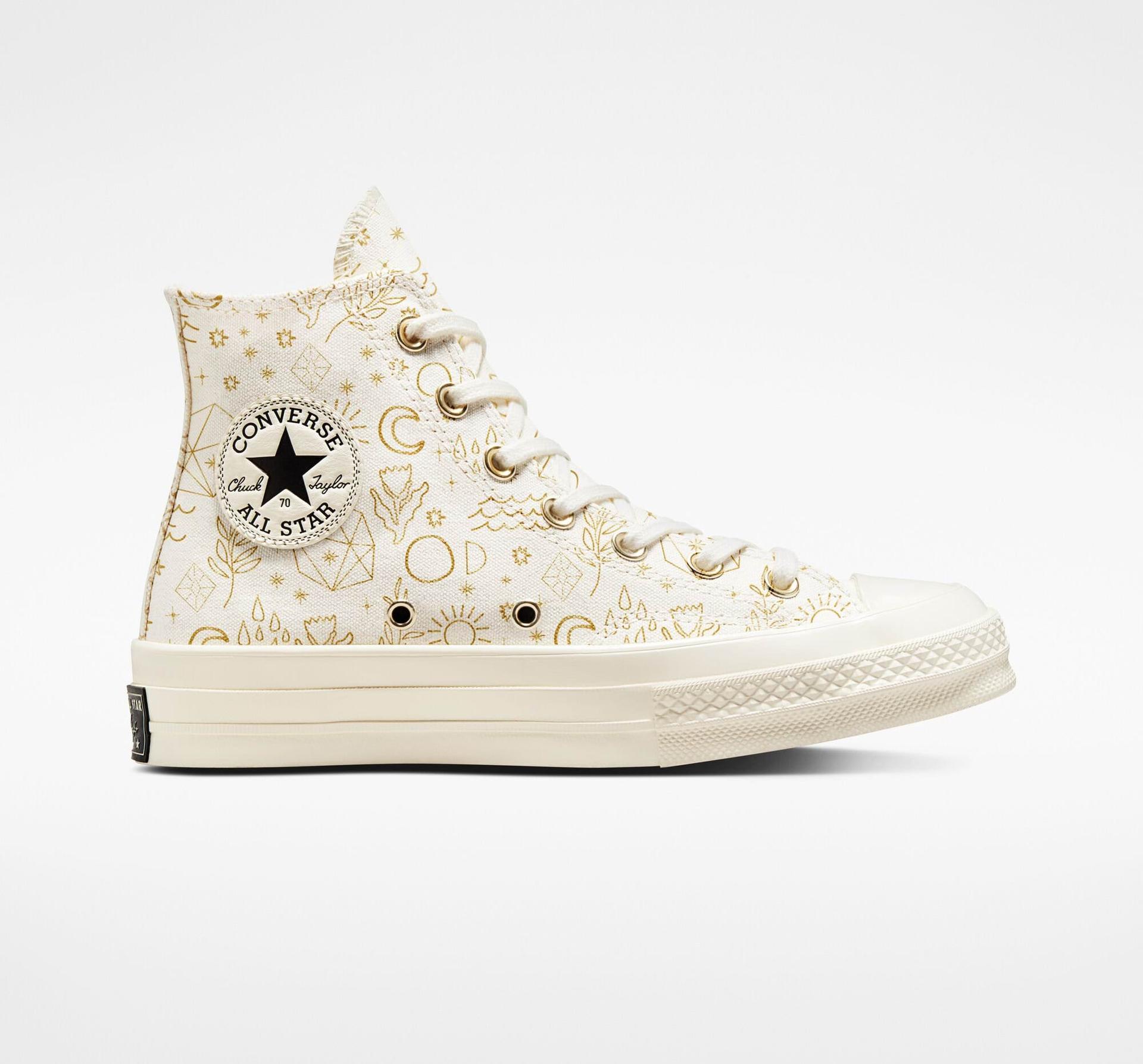 Chuck 70 jde do zlaté s potiskem všímavosti inspirovaným mystickým a elementárním. Jsou zde všechny prémiové detaily, 12 uncové plátno se zlatou grafikou inspirovanou přírodou, komplet s očky ve zlatém odstínu, křídlové prošívání jazyka a tónový proužek. Pohodlná vložka pro podporu vašeho kroku po celý den.