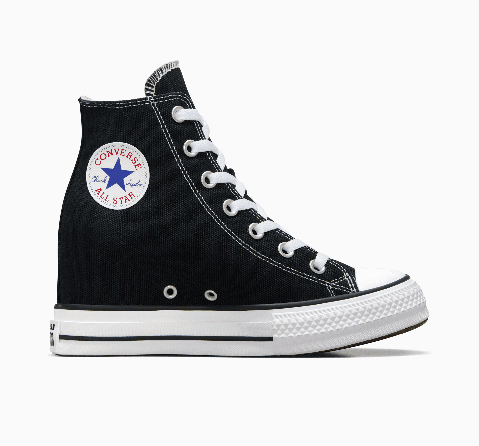 Klasické tenisky Chuck v novej, vyvýšenej verzii. Vnútorný klin pridáva na výške, ale neohrozuje štýl tenisiek All Star.