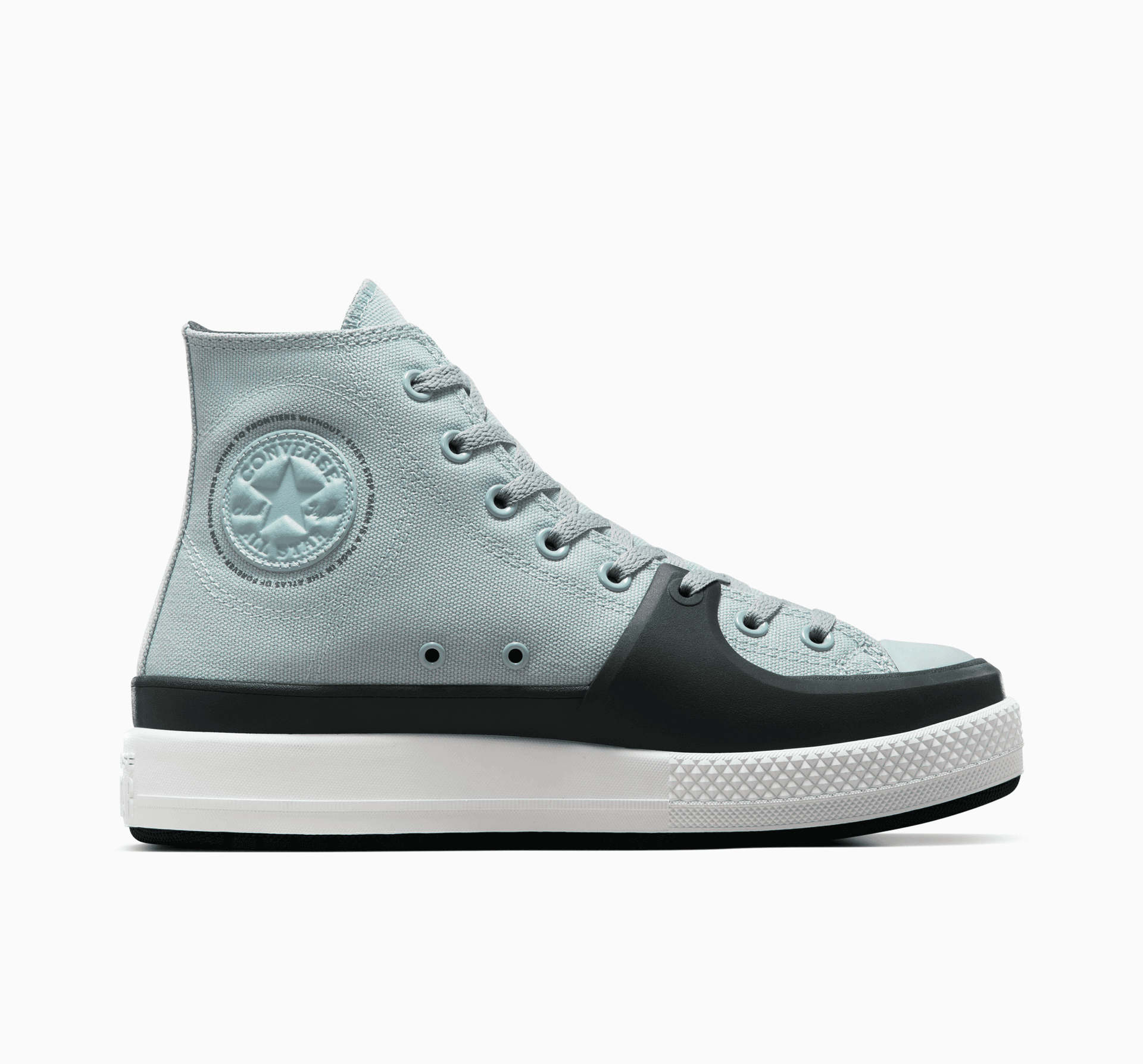S kotníkovými teniskami se přenesete do budoucnosti známé ze sci-fi. Reflektivní sítotiskový potisk terénní mapy působí futuristicky a strohá infografika na mezipodrážce spolu s nášivkou Chuck hrají na postapokalyptickou notu s optimistickým zvratem: Bořte hranice kamkoli jdete.