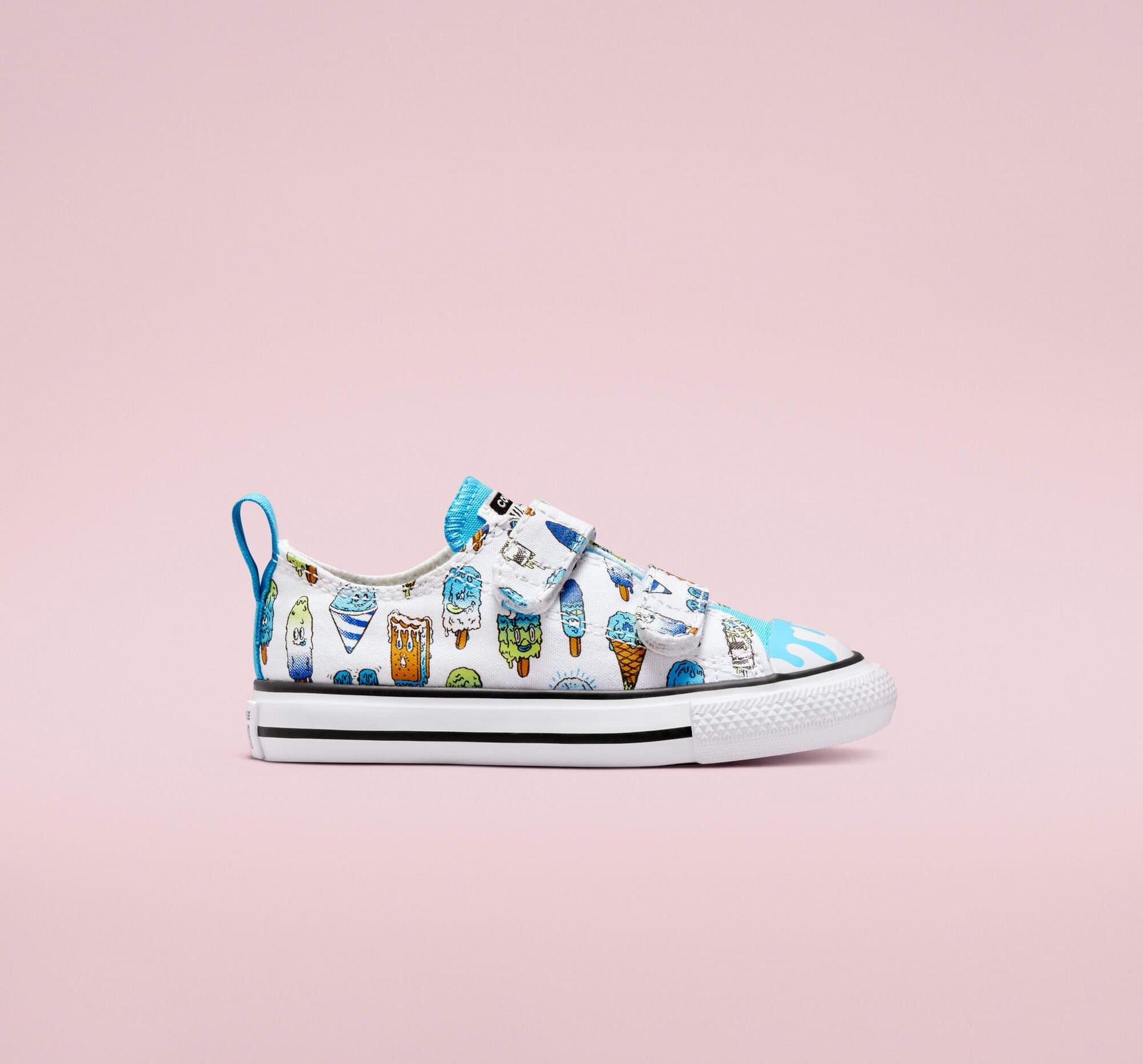Low-topová legenda přepracovaná pro děti, s polstrovanou SmartFOAM stélkou, měkčenými stehy a švy a dvěma popruhy na suchý zip pro snadné nazouvání a vyzouvání. Celoplošný potisk barevných ice popů pokrývá klasický plátěný svršek, což jim dodává na každém kroku trochu sladkosti. Vzhled je doplněn klasikami Chuck Taylor All Star, jako je tkaný štítek "All Star" na jazyku a podrážka s diamantovým vzorem, která udržuje cool vzhled po celé léto.