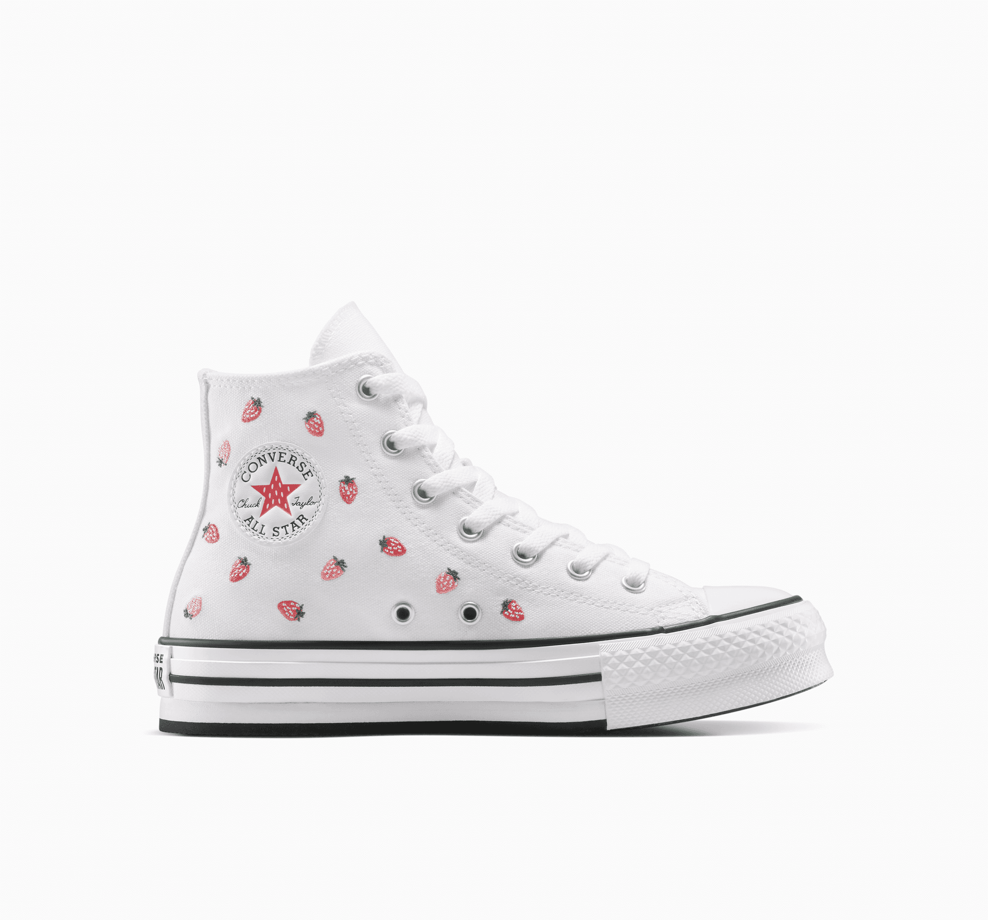 Z takových tenisek budou mít radost, už nemusíte dělat víc. Vyšívané jahody na vyvýšených teniskách Chuck udělají z každého oblečení sladké pokušení.
