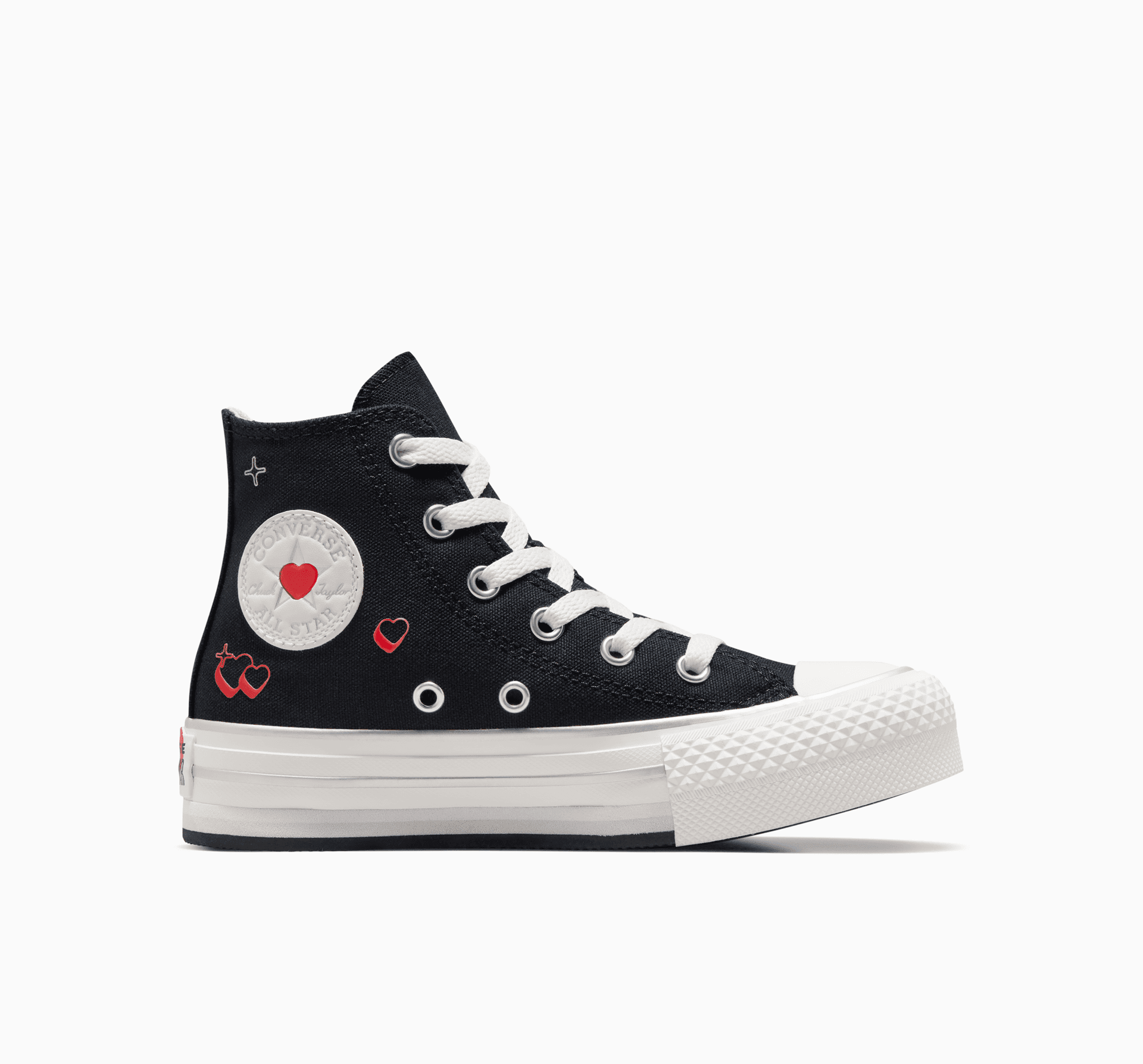 Růže jsou rudé, fialky zas modré. Tyhle platformy Chuck budou mít vaše děti za oblíbené. Srdíčka a metalické prvky jsou milostným dopisem časům Y2K. Proč je mít ještě radši? Přece kvůli nášivce na kotníku se srdíčkem.