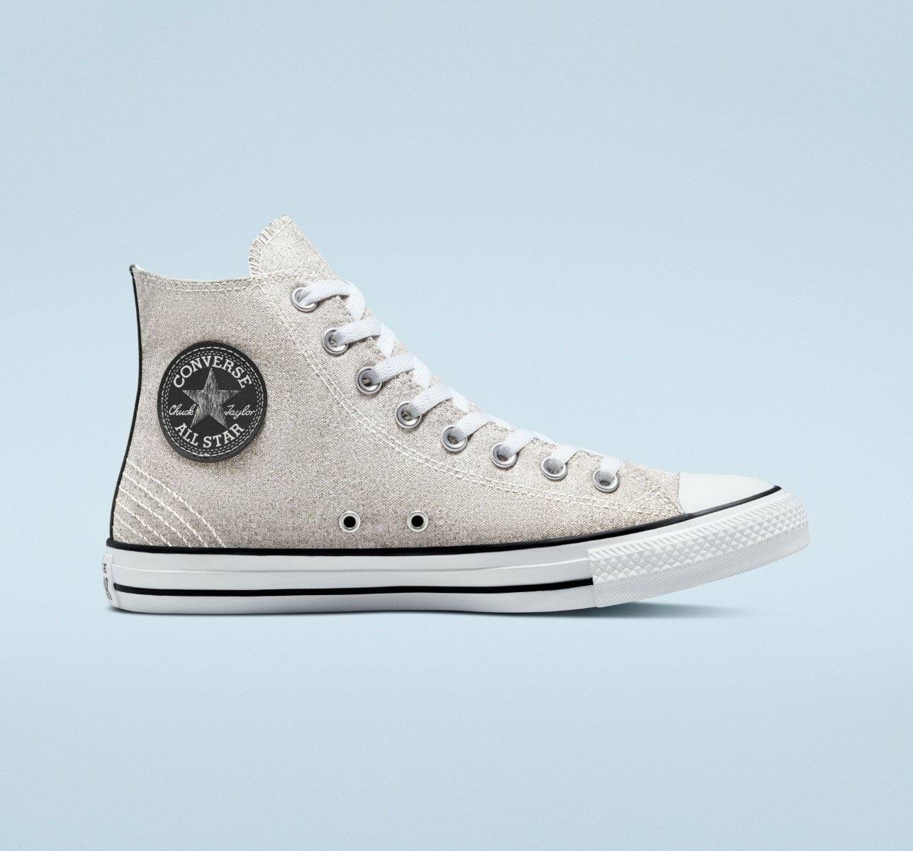 canvas high top. Rounded stitches radiate outwards from the sole, covering