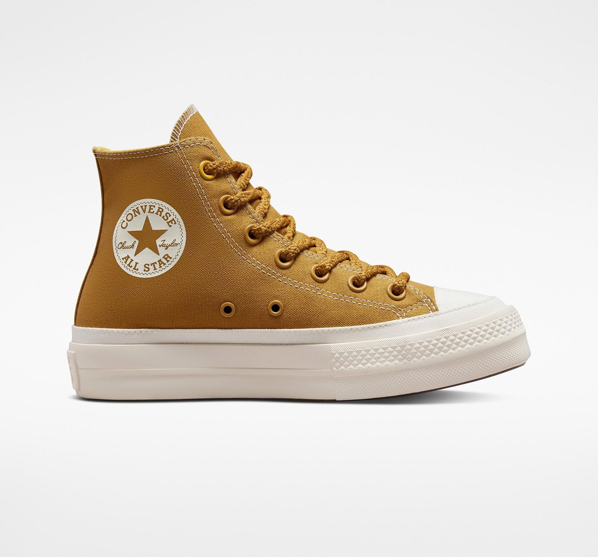Tyto platformy Chuck byly vyrobeny šetrně a využívají přebytečné materiály. Vysoké platformy Chuck s plátěným svrškem doplněným sítotiskovými nášivkami All Star mají velký styl. Praktický design dotvářejí odstíny v barvách tenisek a gumová obsázka na lemech plátěného svršku.