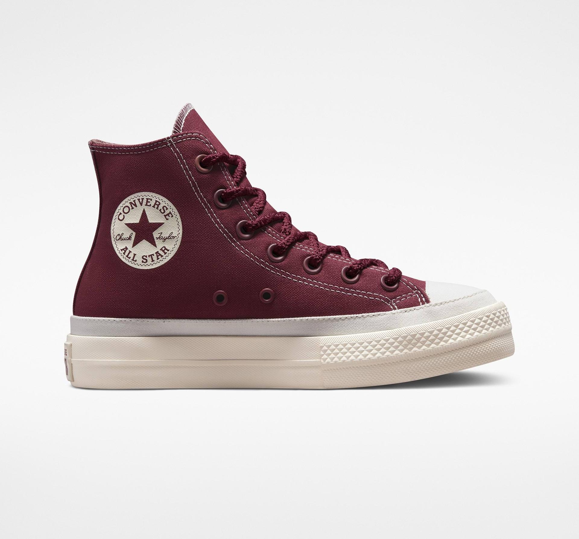 Tyto platformy Chuck byly vyrobeny šetrně a využívají přebytečné materiály. Vysoké platformy Chuck s plátěným svrškem doplněným sítotiskovými nášivkami All Star mají velký styl. Praktický design dotvářejí odstíny v barvách tenisek a gumová obsázka na lemech plátěného svršku.
