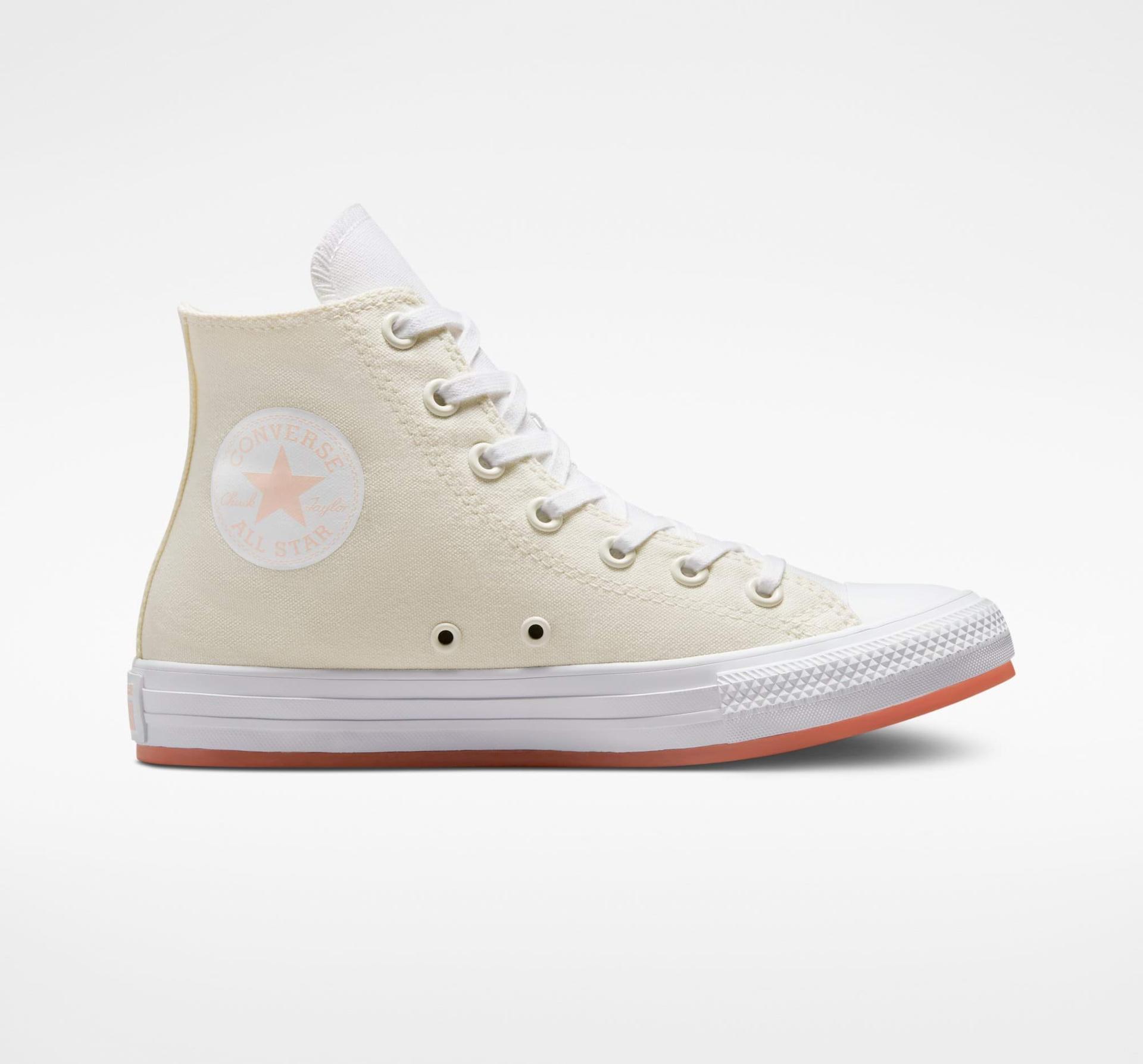 Decentní plátěné tenisky Chuck ve dvou odstínech překvapí nenápadnými mramorovými spirálami na podrážce. Jsou vyrobeny v barvách, které se hodí skoro ke všemu, a mají prodyšnou podšívku, takže jsou ideální na léto.