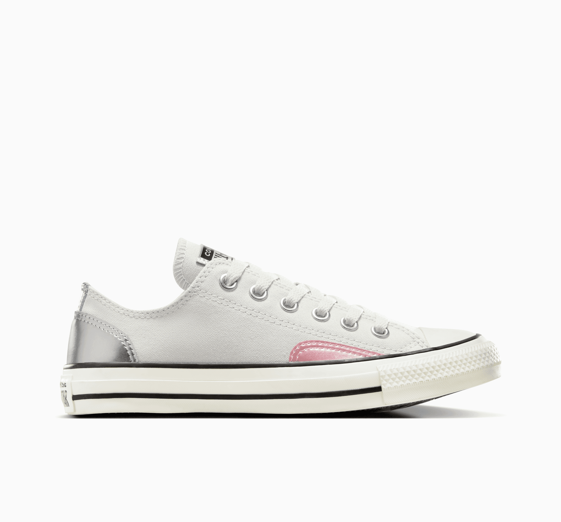 - Plátěný svršek s metalickými překryvy z koženky a klasický styl tenisek Chuck