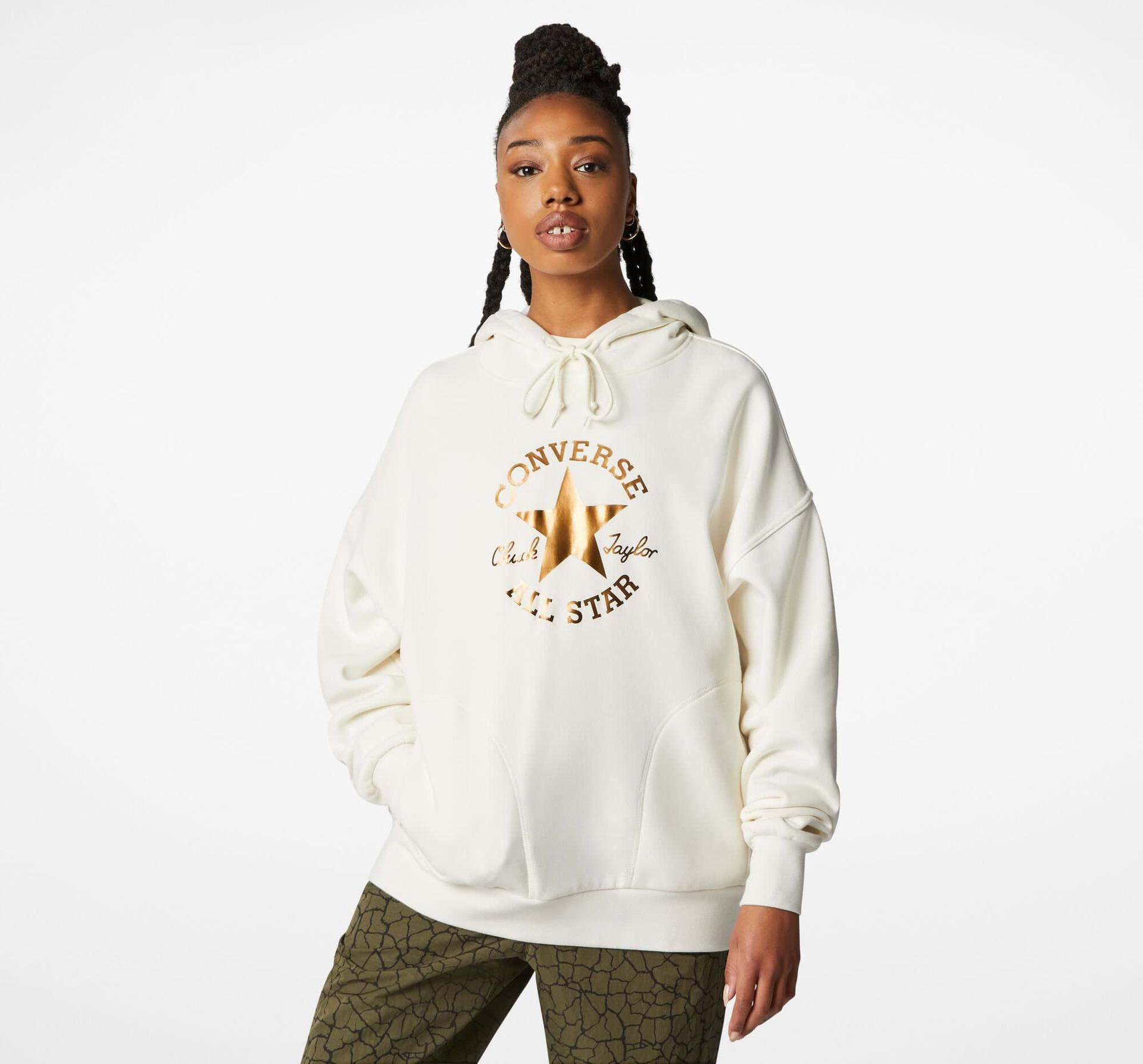 Tato mikina s kapucí je ušita tak, aby zvládla zimní chlad. Příjemný club flís pomáhá udržet teplo, zatímco spadlá ramena a volný střih působí ležérně. Díky měděné nášivce All Star uprostřed přední části zazáříte.