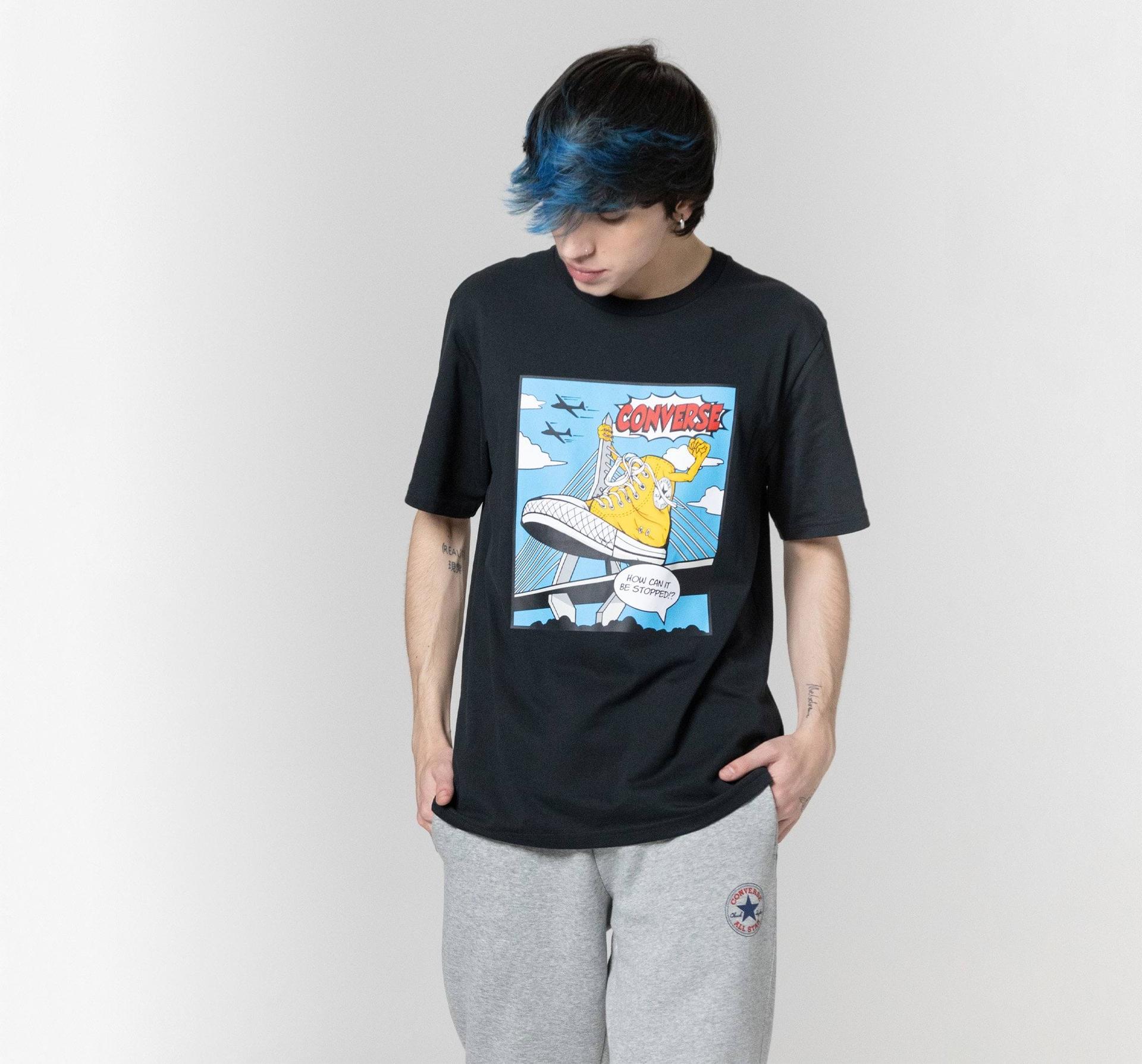 Přesně ve stylu retro komiksů zabírá potisk obrovských tenisek Chuck velkou plochu na tričku z měkkého bavlněného žerzeje. Mocný komiksový obrázek vpředu uprostřed je pogumovaný, aby byl ještě silnější. V tomto tričku se nemusíte ničeho bát, snad jen toho, že si ho budete muset někdy svléknout.