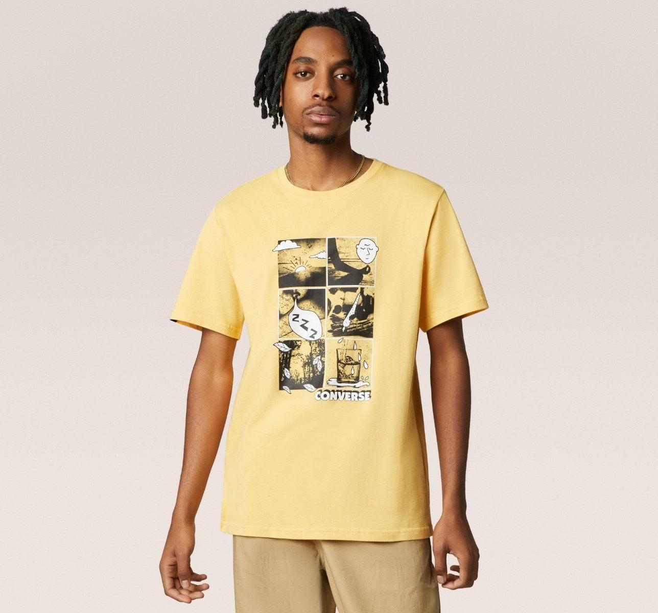 Grafiky Comic znázorňují misi Converse Renew na tomto tričku s klasickým střihem. Zhruba 50 % recyklované bavlny a asi 50 % organické bavlny hostí grafiku ve stylu comic. Z grafiky vyzařují Země, příroda a celkové zdraví, posilňujíce tak ústřední motiv kolekce. Vzhled kompletují krátké rukávy a výstřih ke krku.
