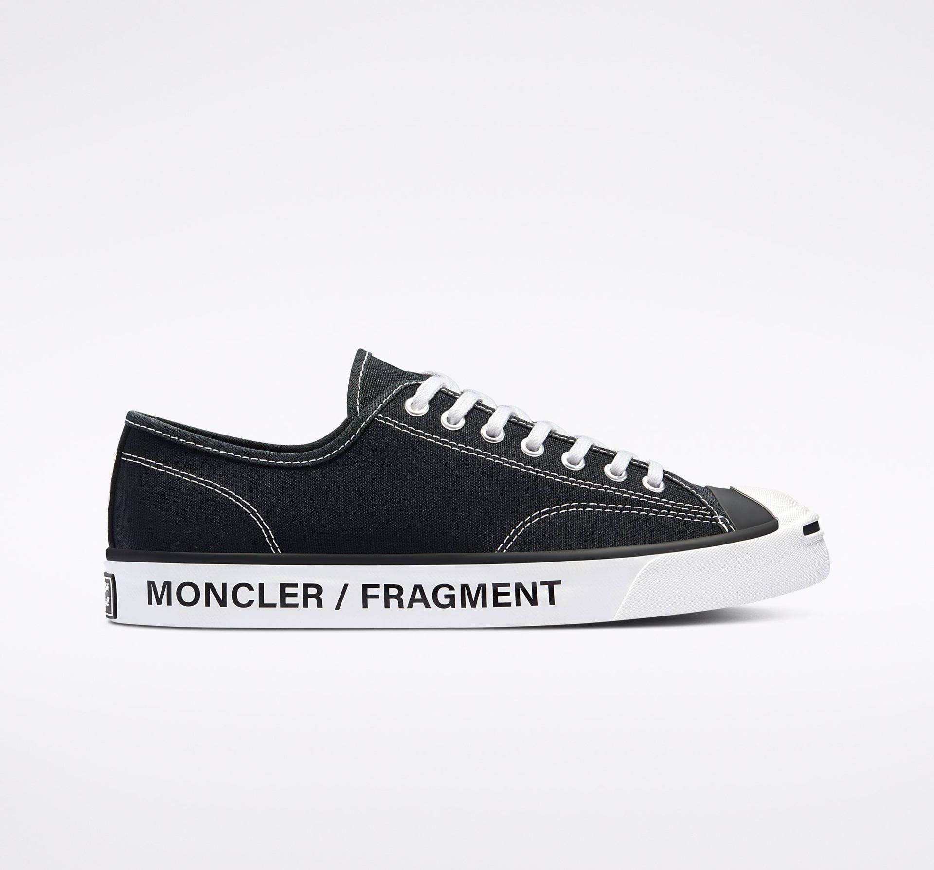 Grafika Moncler / FRGMT na podeszwie środkowej z przekreślonym prążkiem.