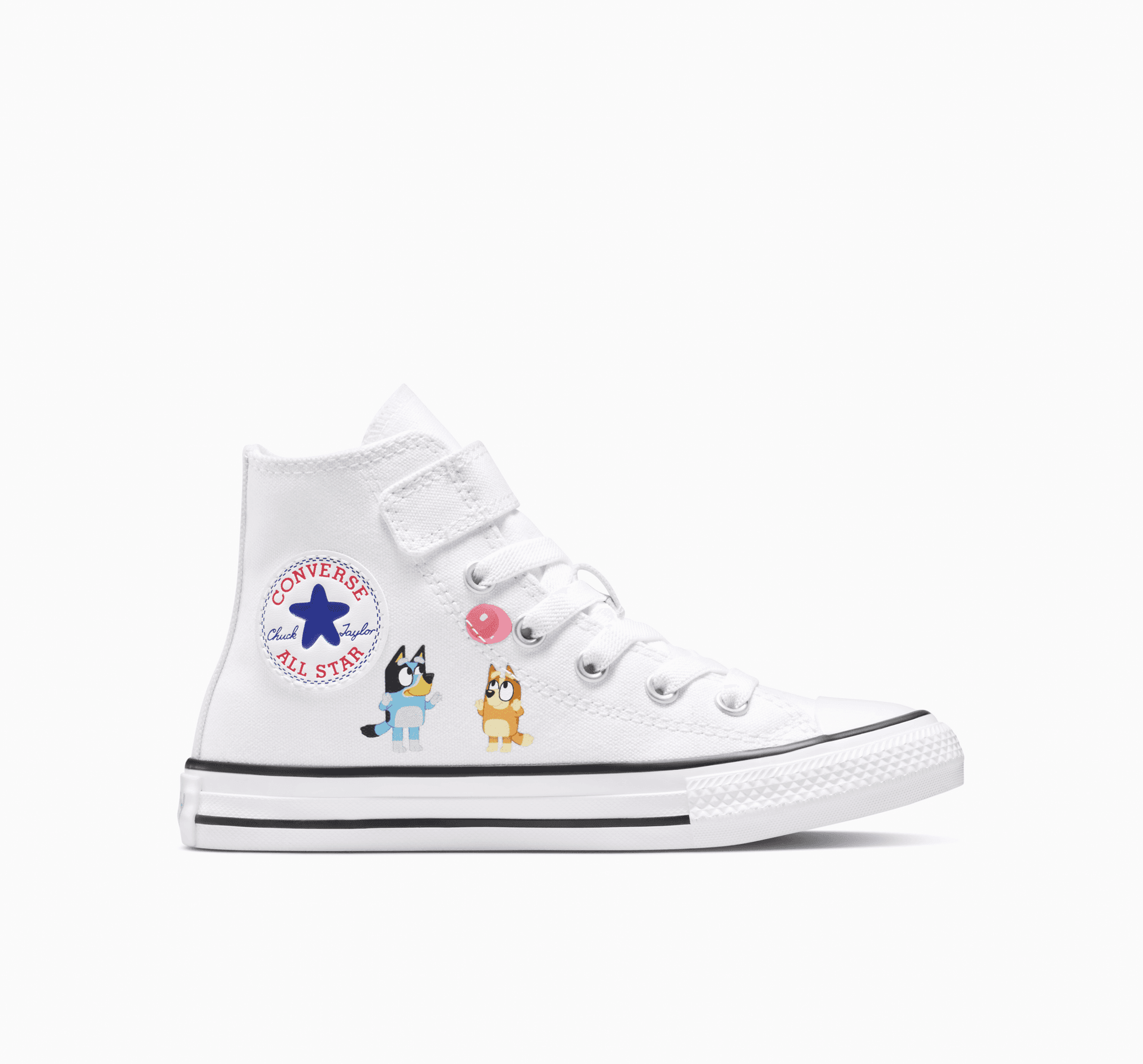 Wackadoo! Bluey se objevuje v klasickém modelu Chuck Taylor All Star pro děti s barvami a grafikou inspirovanou seriálem. Design kombinuje grafiku z epizody „Keepy Uppy“ s typickými detaily Chucka, jako je reliéfní nášivka na kotníku, černé proužky a retro poznávací značka. Oslav nadčasovou sílu kreativní hry s klasickým stylem Converse.