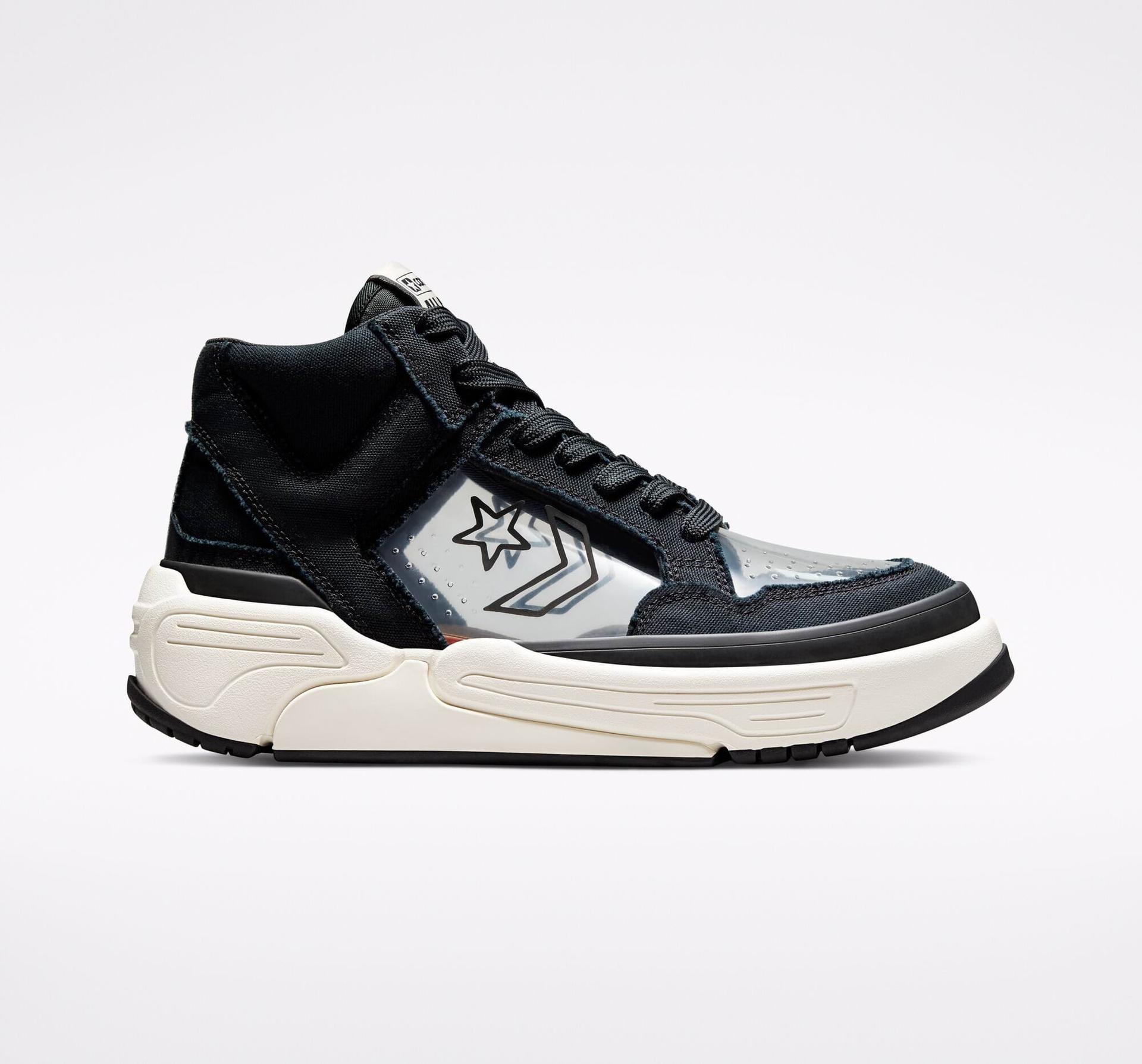 features a canvas upper with a frayed finish, perforated transparent TPU