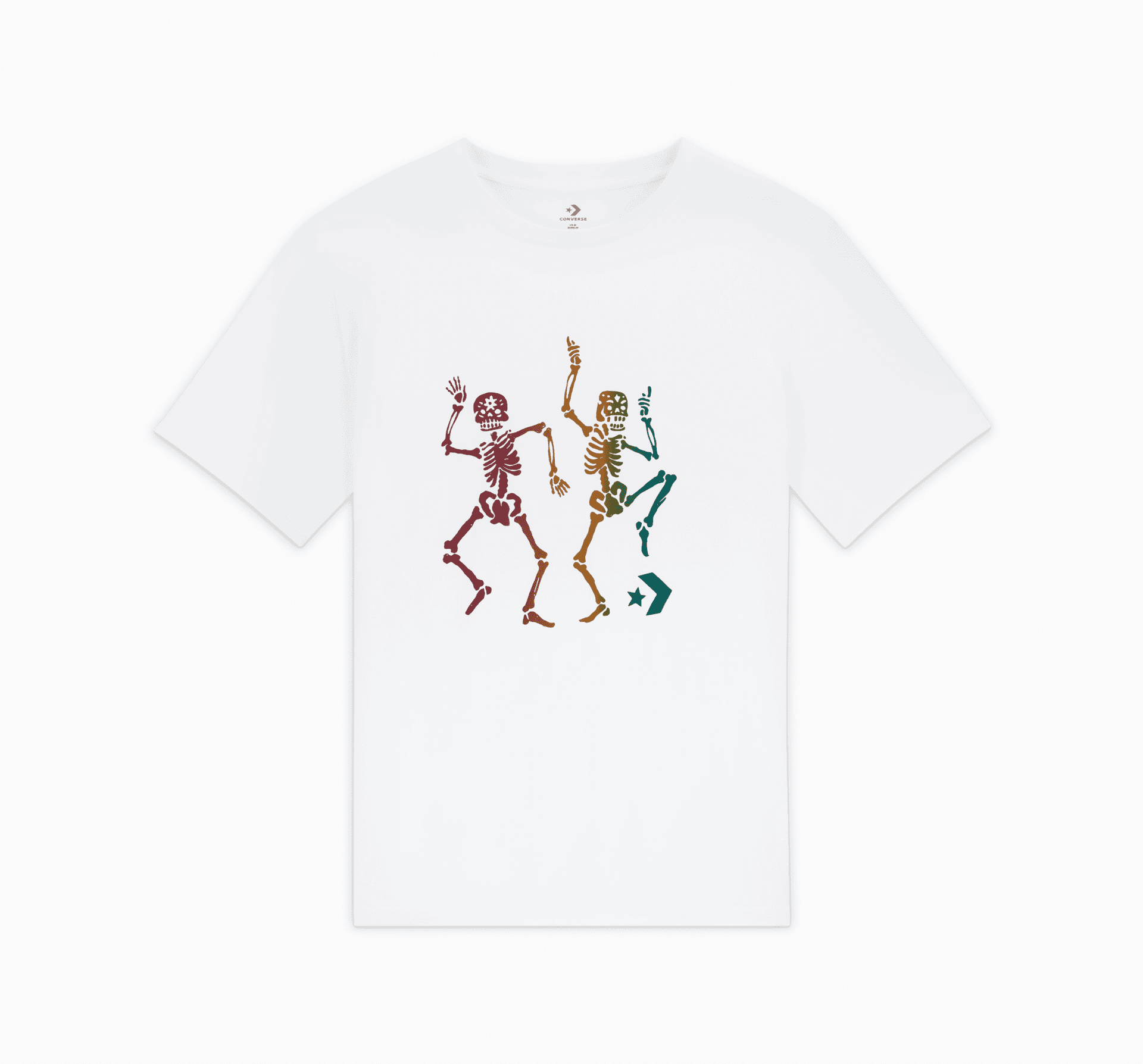 Bílé bavlněné tričko s tančícími kostlivci v gradientních sezónních