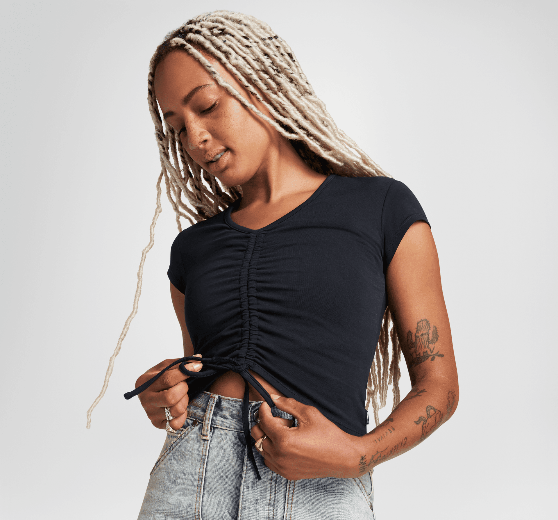 Pohodlný jako tričko a styl skvělý na Instagramu. Stahovací šňůrkou řasený top si můžete přizpůsobit tak, aby odpovídal každé vaší náladě.