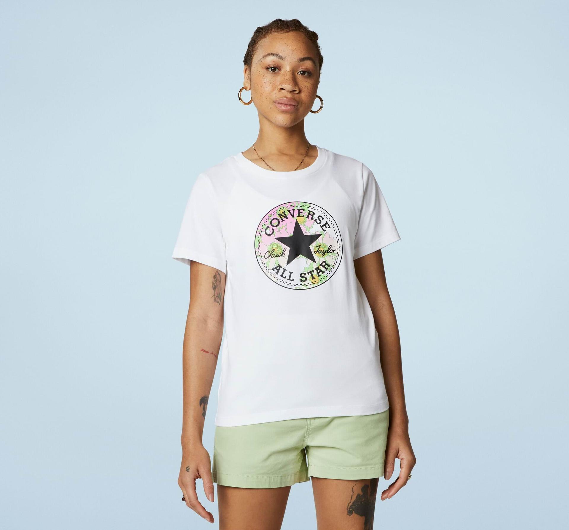 Na tomto tričku připraveném na léto prostupují skrze znak ikonického loga Chuck Taylor All Star čerstvé letní květy. Grafika přináší ležérní sezónní barvy na měkkou bavlnu. V jednoduchém, klasickém střihu s výstřihem ke krku a krátkými rukávy. Stačí přidat slunce.
