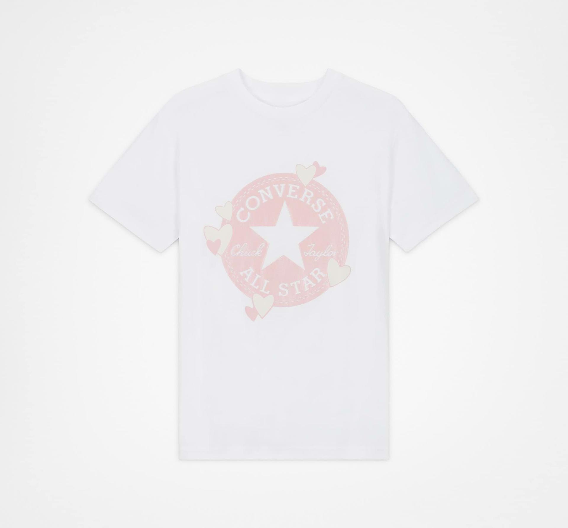 Tričko, které snadno padne, dodá vašemu outfitu na rande nový rozměr. Velká nášivka s logem Chuck, která je pokrytá výraznými srdíčky, vás dostane do víru lásky. Klasický kulatý výstřih navíc znamená, že tričko můžete nosit samostatně nebo ho zkombinovat s oblíbeným svetrem.