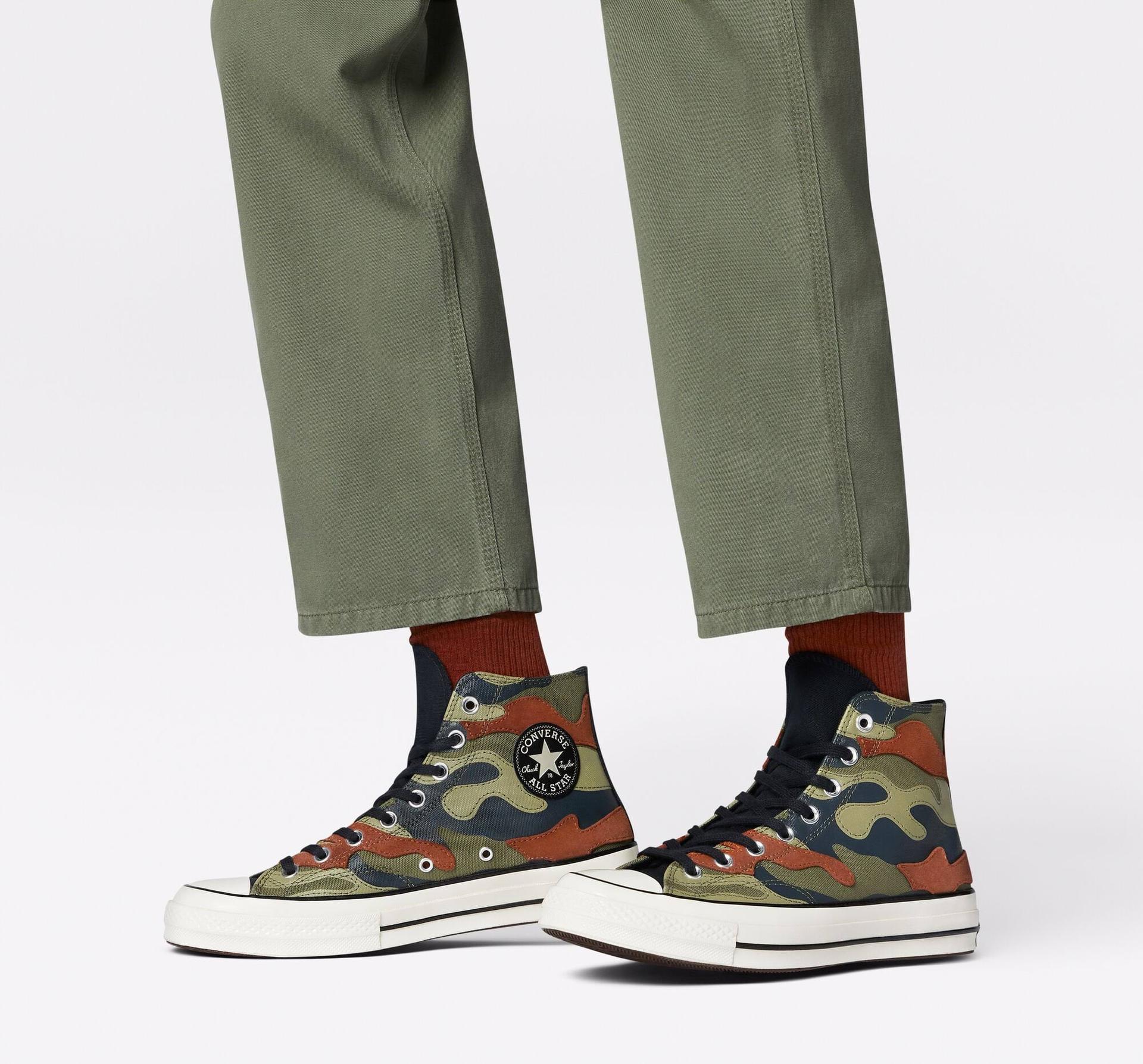 Tenisky Chuck 70 dostaly na organický plátěný svršek celoplošný maskáčový sítotiskový potisk, který překrývá semiš. Potisk inspirovaný přírodou doplňuje základní designové prvky, včetně lesklé gumové hrany podrážky, švů pro vyztužení na prohnutém jazyku a retro nášivku s hvězdou na kotníku. Stélka OrthoLite udrží nohy v pohodlí po celý den. OrthoLite je obchodní značka společnosti O2 Partners, LLC.