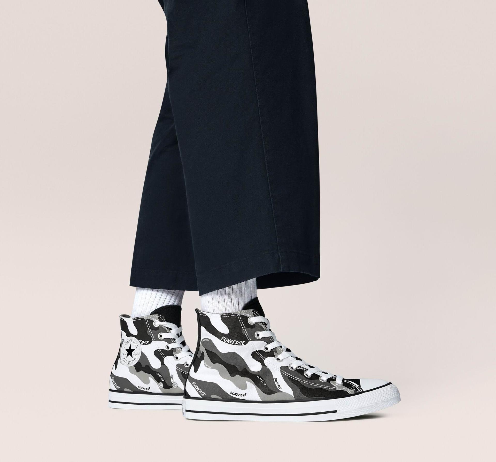 - Kotníkové tenisky s plátěným svrškem s maskáčovým potiskem v kombinaci se slovy Converse.