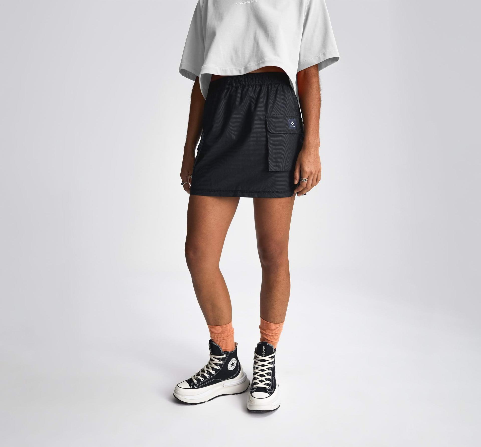 Mini sukně s vysokým pasem a se strečem je díky směsi nylonu a bavlny lehká. Aby byla tato sukně opravdu praktická, má velké kapsy, do kterých schováte vše, co potřebujete. Potisk se vzorem heatwave v tlumených odstínech pozvedne váš outfit na novou úroveň.